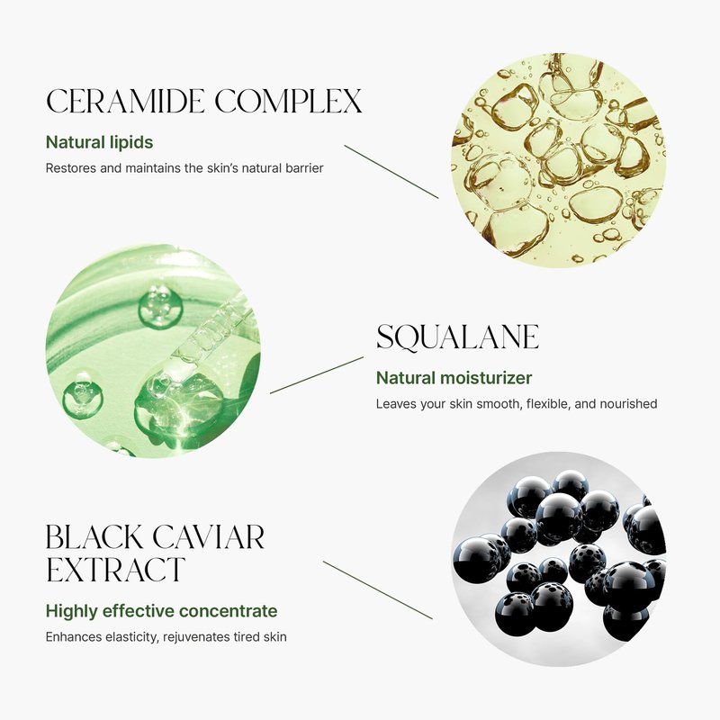 - Exceptional Ingredients: Squalane is a natural moisturizer and skin softener that closely resembles the oils naturally present in our skin. Black Caviar Extract aids in enhancing skin elasticity, rejuvenating tired skin, bringing a touch of luxury to your skincare. Enriched with Ceramides, the Cream includes this essential lipid to fortify the skin's natural barrier.