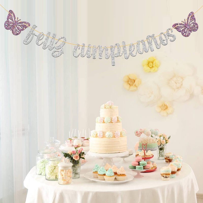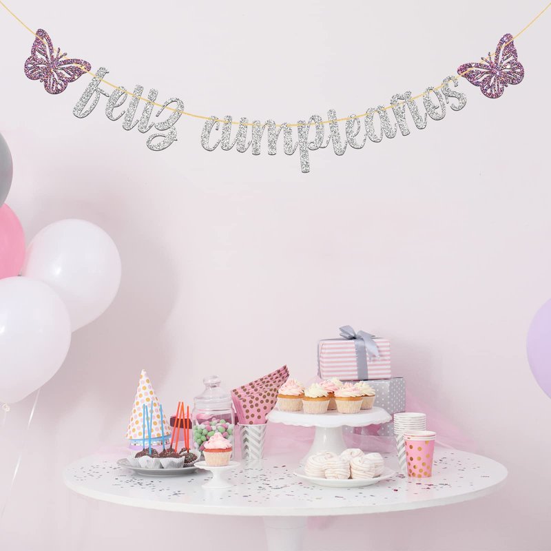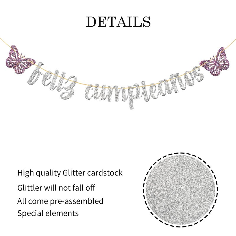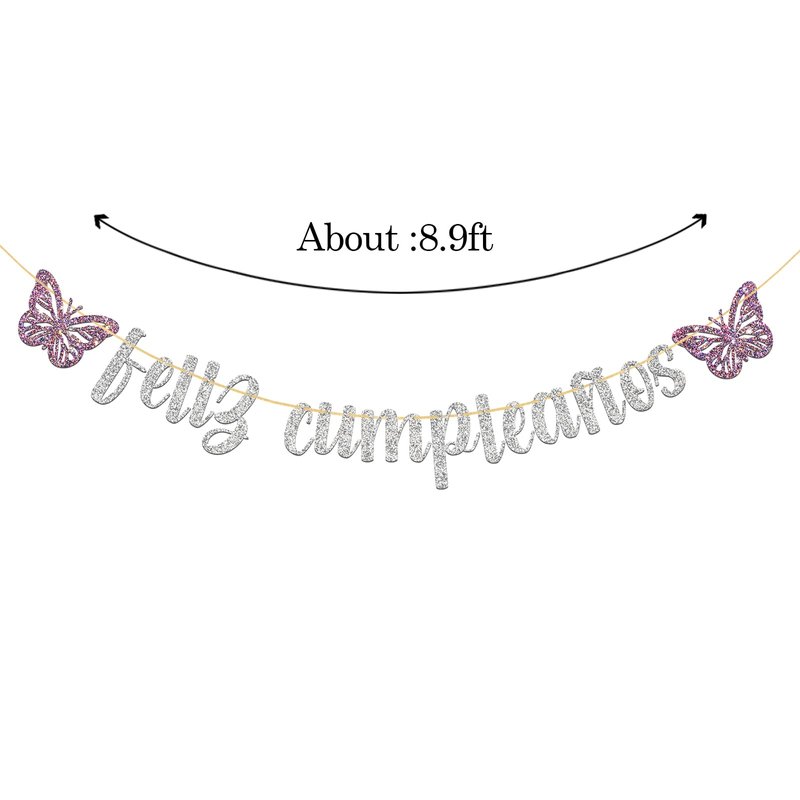 WeBenison Feliz Cumpleaños Banner/Fiesta Theme Happy Birthday Party Supplies/Spanish Birthday Party Decorations Butterfly Sign Silver Glitter