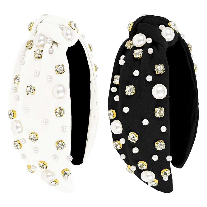 Wecoe 2 Pack Black White Knotted Headbands Rhinestone Pearl Headband For Women Girls Wide Headbands Non Slip Fashion Cloth Sparkly Diamond Beaded Headbands Hair Accessories For Women Girls Gifts