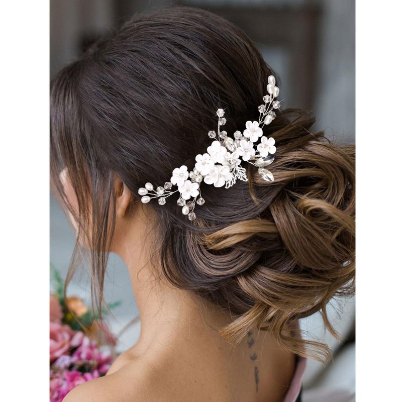 Indulge in timeless elegance with our exquisite hair accessories, meticulously crafted for the modern bride, bridesmaids, or any special occasion. Elevate your hairstyle with these stunning decorative hair combs, featuring a harmonious blend of lustrous pearls forming delicate floral motifs and shimmering rhinestone-studded diamond leaves. Crafted from premium materials, these updo hair accessories ensure both durability and comfort throughout your special day, making them the perfect hair jewelry for women seeking an extra touch of glamour. Whether you're adorning a classic up-do or accentuating loose waves, these hair side combs effortlessly secure your locks while adding a touch of enchantment. These fancy hair clips are not just bride must-haves for the wedding day but also make for a heartfelt gift for the bridesmaids, symbolizing appreciation and shared memories. Their unique design, a balance of sophistication and whimsy, transforms them into versatile hair ornaments suitable for first communion headpieces for girls or even as after-wedding outfit enhancements for the blushing bride. Embrace the beauty of nature-inspired adornments with our white hair accessories that effortlessly complement any bridal gown or evening ensemble. Designed to enhance hair updos with a touch of grace, these flower girl hair accessory are as functional as they are fashionable, securing even the most intricate hairstyles. For vintage enthusiasts, our vintage hair comb offers a nod to old-world charm while infusing contemporary flair, making it a go-to among formal hair accessories for women who appreciate the finer details. Transform every event into a memorable affair with these exquisitely designed hair pins, a testament to the beauty of combining tradition with modernity. Experience the art of enhancing your natural radiance; choose a piece that whispers opulence and becomes a cherished part of your most treasured moments.