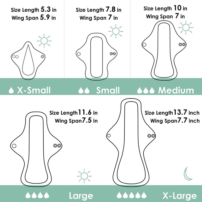 - 6pcs Cloth Pads in 5 Sizes: Each set cloth menstrual pads including 6 pack cloth panty liners. Wegreeco feminine Pads for Women are available in 5 sizes. Extra Small size length 5.3 in, wing span 5.9 in, Small size length 7.8 in, wing span 7 in, Middle size length 10 in, wing span 7 in, Large size length 11.6 in, wing span 7.5 in, Extra Large size length 13.7 in, wing span 7.7 inch