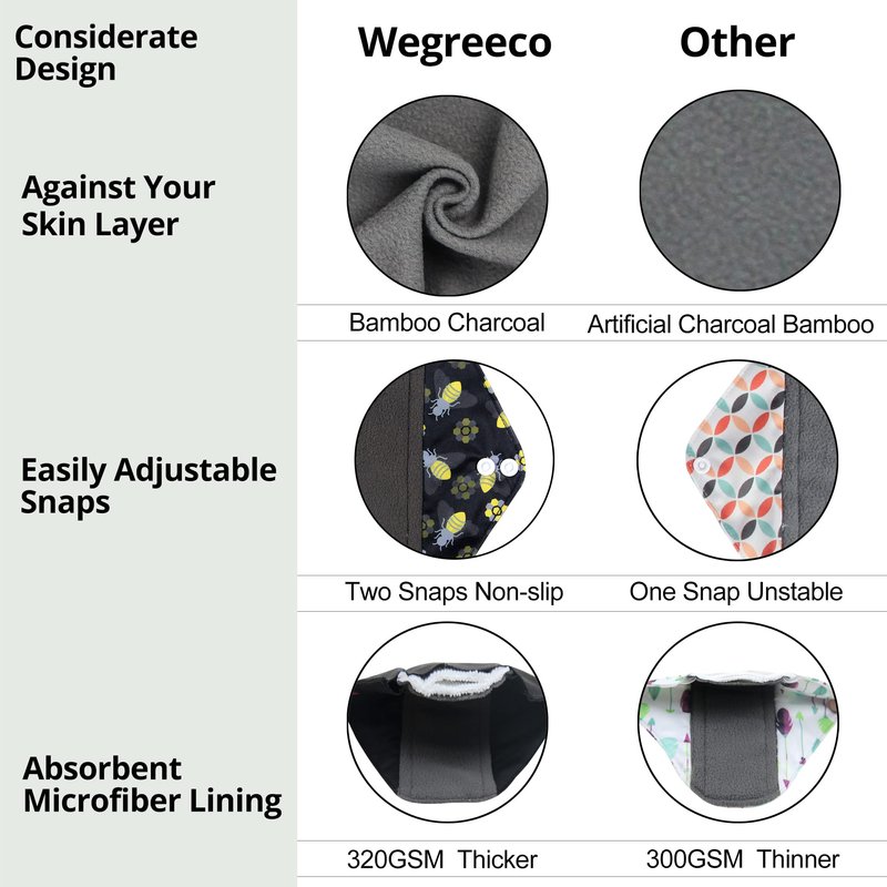 Wegreeco strives to make things that lessen the amount of trash a family produces. She is on a mission to bring more reusable products into homes by making them practical, beautiful. The reusable products that wegreeco currently carry are Baby/Dog/Adult cloth diapers,cloth sanitary pads,cloth nursing pads,reusable pail liner etc.When you buy and use a reusable product,you are showing your children how to care for the world they will inherit. Material Outer Shell - Leak-free lamination fabric,which keeps off leakage. Inner: charcoal against ladies skin for utmost comfort. Middle Microfiber layers pads - provides maximum absorbency.Care Rinse pads with cold water to keep off staining and wash separately.Then place into Small Pounch or Wet bag. Cold rinse with no detergent followed by a hot wash with 1/2 the recommended amount of detergent.Tumble low or hang to dry. When you are away from home,place the used pads in Wegreeco Mini Bag until you return home.Wash per care instructions. Don't wash the pads in public facilities.The pads are meant for personal use only and should not be shared with others.