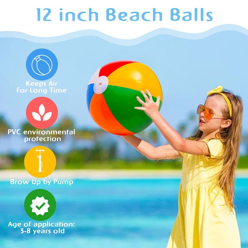 - 【12 Pack Beach Balls】 12" Inflatable beach balls for pool for superb fun! The traditional classic rainbow color!Beach Balls 12 inch before inflation, 8 inch after inflation.