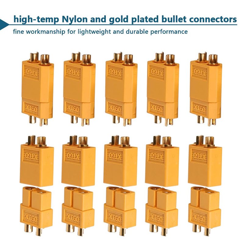 - XT60 Connector fits for RC Lipo Batteries Drones Airplanes Cars Vehicles, XT60 Male Female Bullet Connectors contain 10 pairs of XT60 Male and Female power connectors.