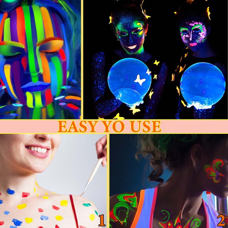 - 🌈【Neon Light Sensation】Face paint gives you a brilliant neon color in the dark, with an impressive light effect that makes you more visible.