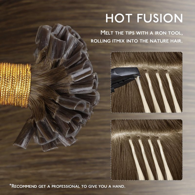 - 【Hot Fusion Installation】It is important to note that utip hair extensions are recommended to be performed by a professional hairdresser to ensure safety, and to achieve the desired aesthetic effect. After applying extensions, avoid using high-temperature tools directly on the roots to prevent damaging the adhesive and hair strands from falling out. Regularly check extensions; repair or replace loose or broken ones promptly for prolong life. Disassembly requires professional assistance.