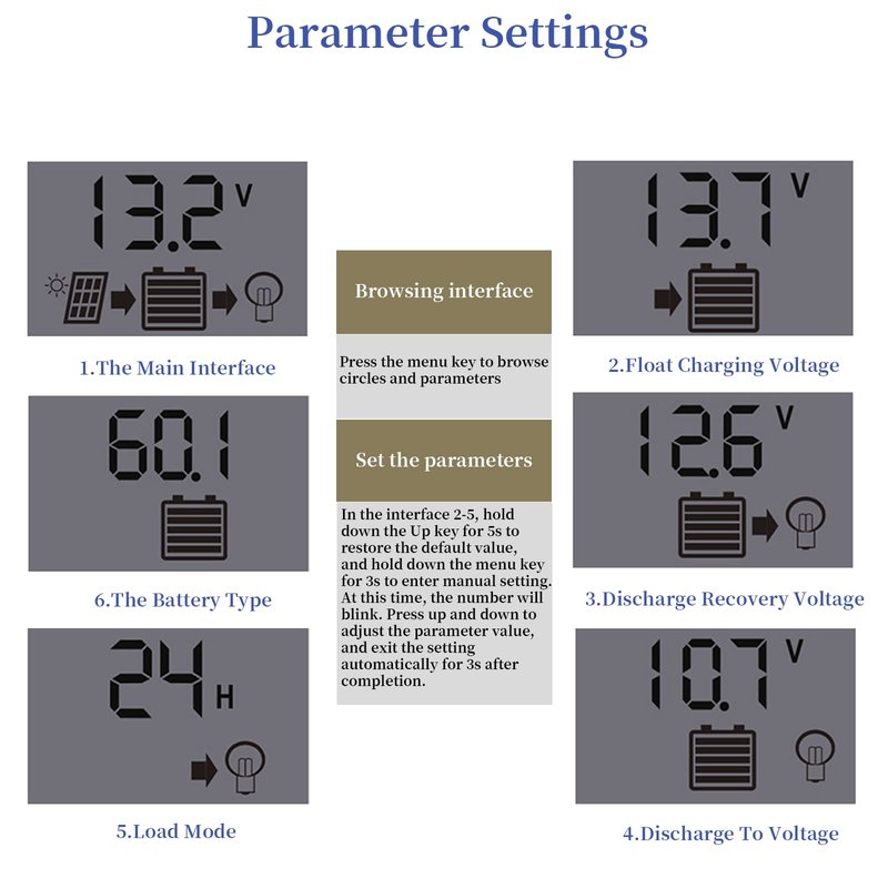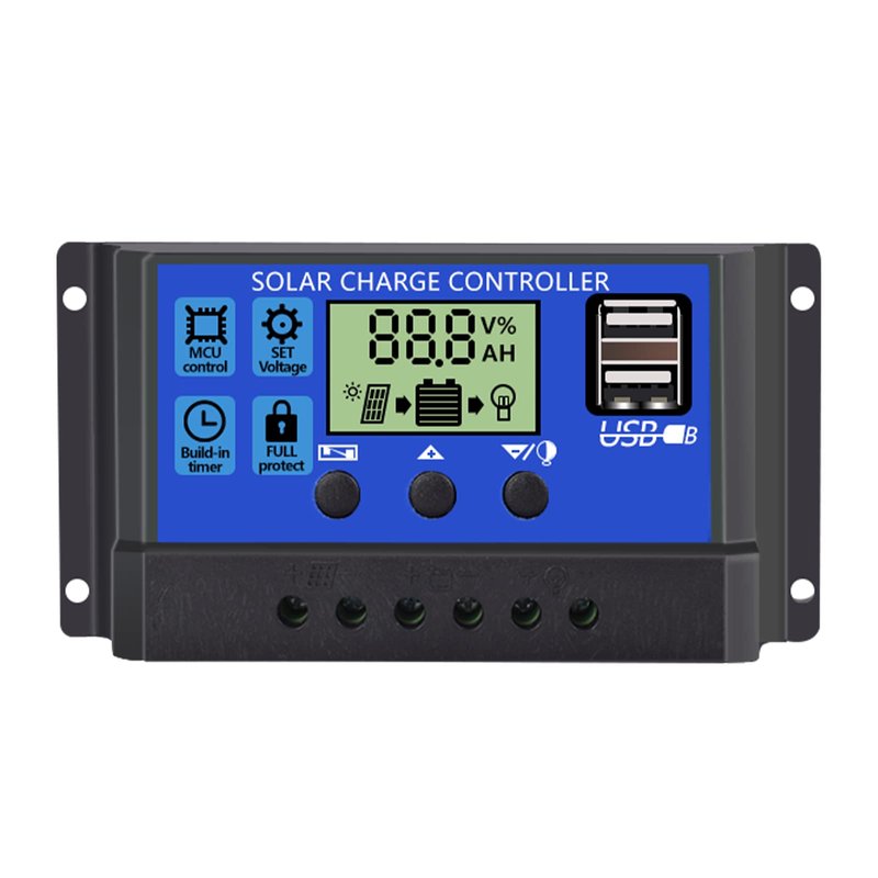 - SMART PWM TECHNOLOGY: The controller compatibility with 12V and 24V system, Discharge Current: 30A; dual USB output 5V / 2.5A, Build-in industrial microcontroller for automatical management, memorizing various parameters set by the user and the data won't be lost when the battery runs out, suitable for lead-acid batteries: OPEN, AGM, GEL. Controller mode: b1: lead-acid. b2: ternary lithium. b3: Lithium iron phosphate.