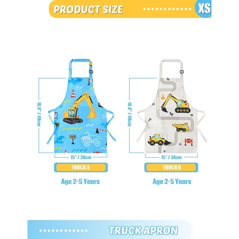 - 【EXCAVATOR DESIGN】If your boys wants to do crafts, gardening or other activities, an excavator patterned apron for kids can help him. The package includes of a blue apron and a grey apron for your needs!