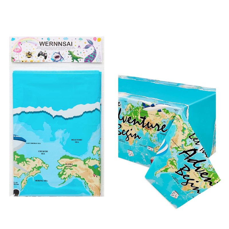 WERNNSAI Adventure World Awaits Tablecloth - 1PC 54" x 108" Travel Themed Party Decorations World Theme Table Cover Plastic Disposable Tablecloth for Boys Graduation Baby Shower Birthday Supplies