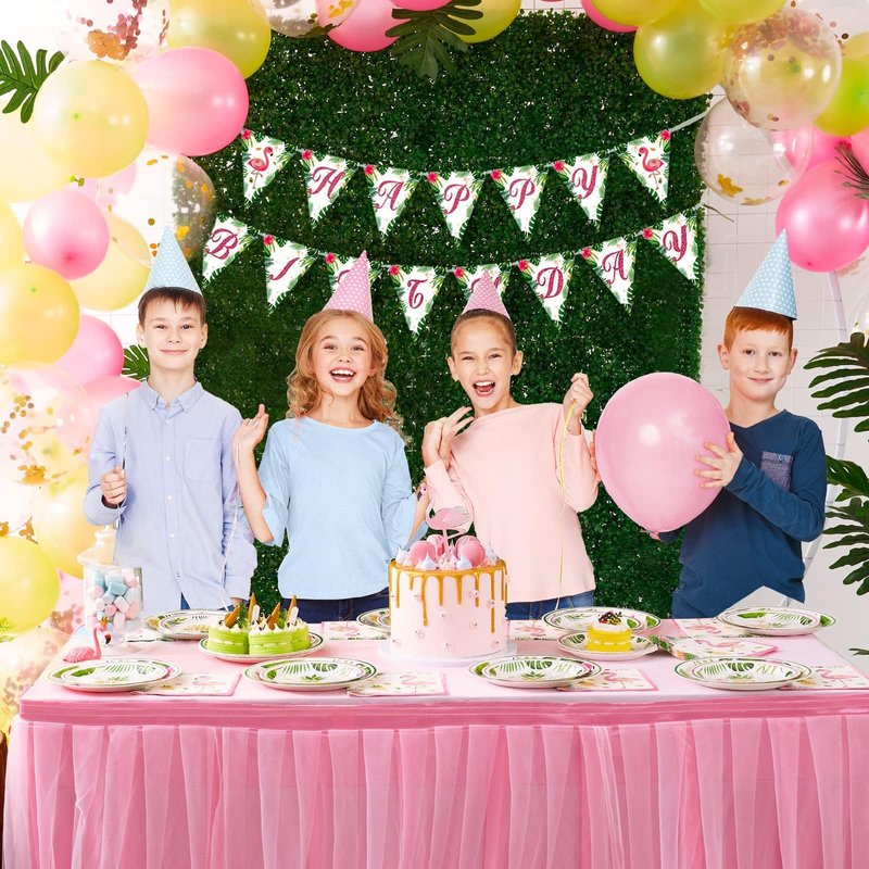 -This flamingo disposable tableware is the best choice for your summer luau party. -Made from safe and environmentally friendly materials, 100% harmless for you and your kids. -You would have 48 pieces party supplies at one time. Enough for 16 guests. -Package Content: 16 × Dinner plates 9“ / 16 × Dessert plates 7” / 16 × Napkins. 12.8” × 12.8” .