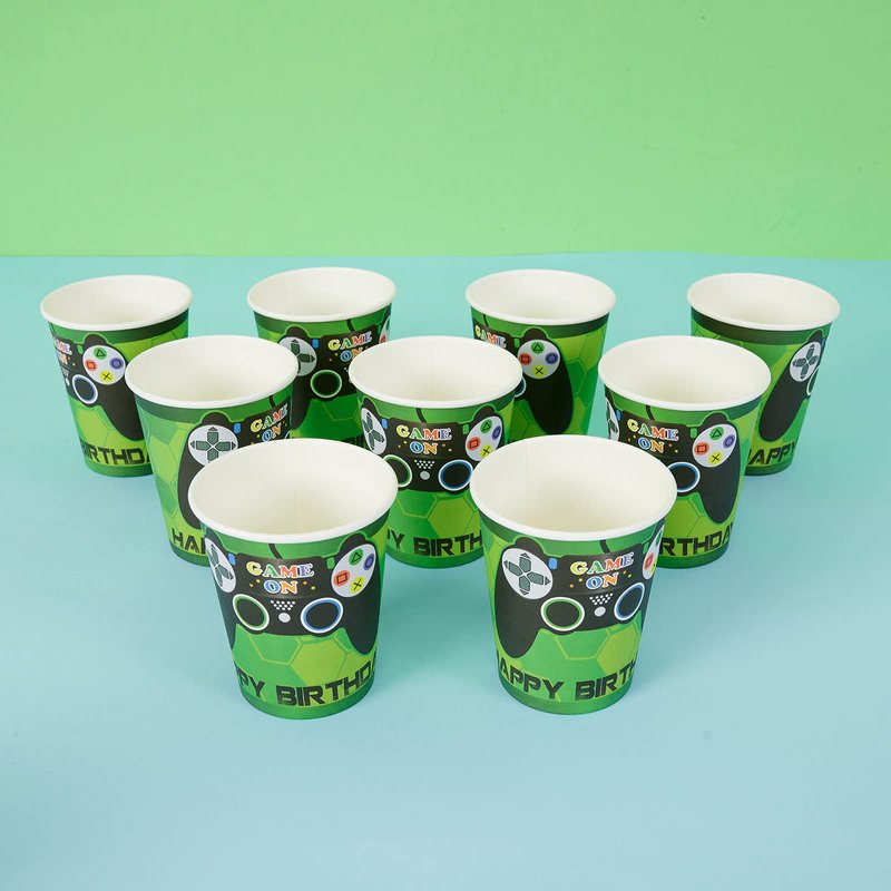 ---Features And Benefits: - Special design for boys and game player, so magical and cool. - Save preparation time and enjoy the party. This is the most important time for you. - Plates are thick and rigid to make sure won't fold while carrying food. - You would have 64 pieces video game party supplies at one time. ---Package Included: 16 × Dessert plates (7 inches) 16 × Dinner plates (9 inches) 16 × Napkins (12.8 x 12.8 inches ) 16 × Paper cups (9 oz)