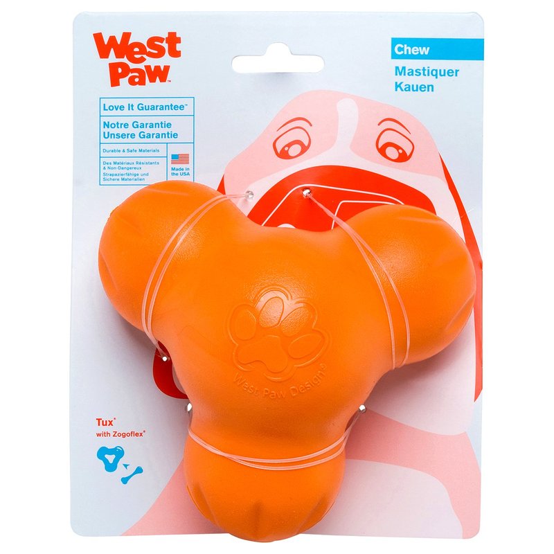 West Paw Zogoflex Tux Treat Dispensing Dog Chew Toy – Interactive Chewing Toy for Dogs – Dog Enrichment Toy – Dog Games for Aggressive Chewers, Fetch, Catch – Holds Kibble, Treats, Small 4", Tangerine
