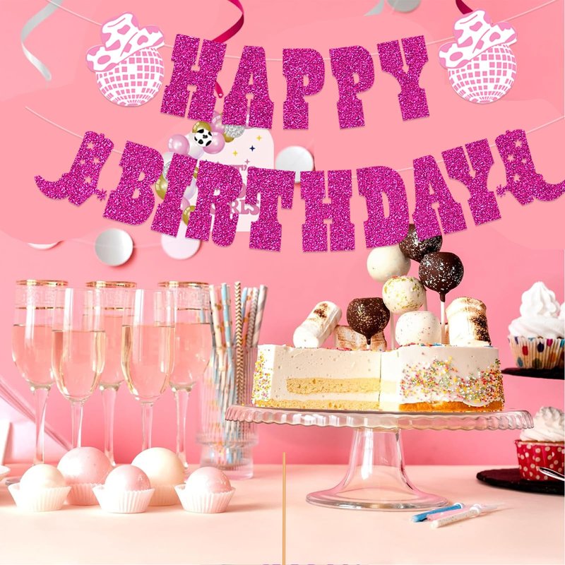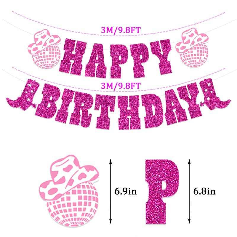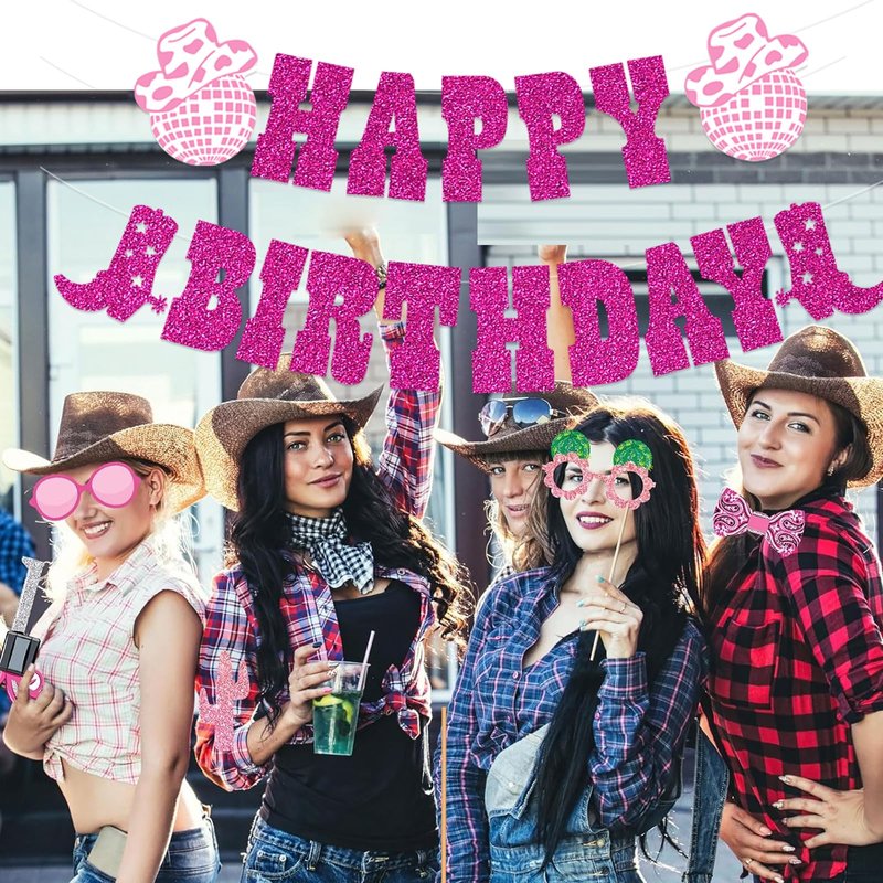 - 1... PINK Cowgirl birthday party decorations - Include 2 PCS pink glitter birthday Banner and 1pcs Happy Birthday Cake Toppers Decoration, These disco cowgirl birthday party decorations in lovely muted tones are perfect for a preppy birthday or evens and are suitable to use for cowgirl birthday decorations