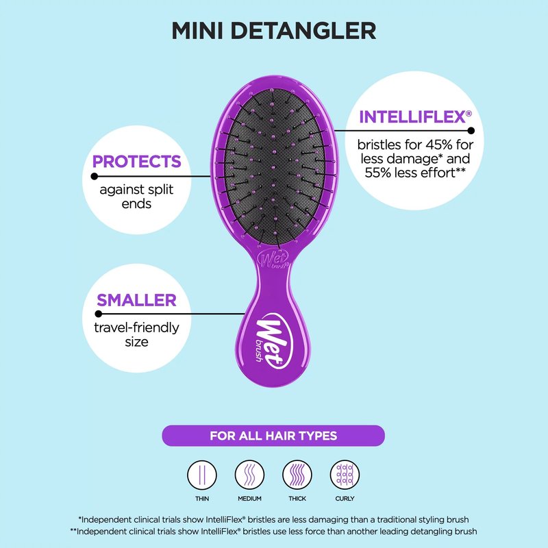 - EXCLUSIVE ULTRA-SOFT BRISTLES: The mini detangler hair brush features exclusive ultra-soft intelliflex bristles glide through tangles and knots with ease. The exclusive IntelliFlex bristles minimize pain, split ends and breakage of hair, provides a healthy and effective way for hair care. It provides Over 45% less damage. 56% less effort. 100% happier hair. Do not use with blow dryer as heat may damage bristles. Use the Wet Brush Speed Dry instead.