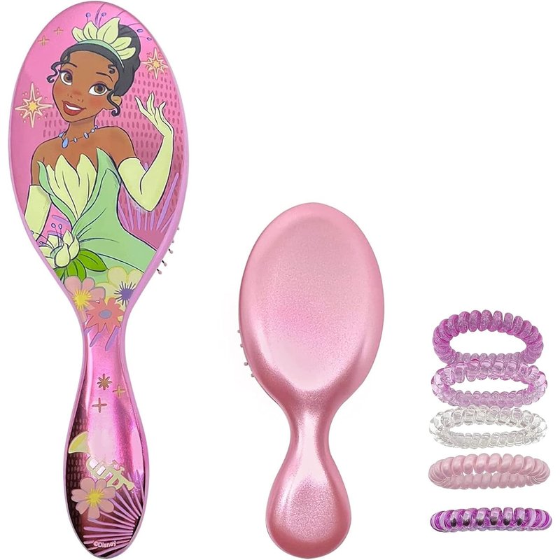 Wet Brush Princess Tiana Original Detangler Big & Small, 5 Ouchless Ponytailers hair ties - All Hair Types - Ultra-Soft - Comb For Kids Men, Women, Boys & Girls