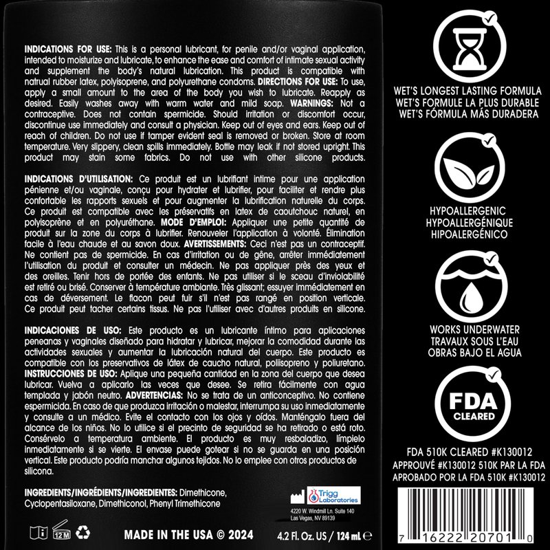 - Slip Into Luxury: Enhance your sexual experience and take your pleasure to a whole new level with Wet's Platinum Luxury Silicone personal lubricant, now with upgraded packaging! Perfectly formulated for long-lasting, slippery sessions, this pure, high-grade silicone lubricant can help relieve dryness and discomfort for smooth sailing during every intimate occasion. Use it anywhere, even underwater, whenever the moment takes you. One 4.2 oz bottle.