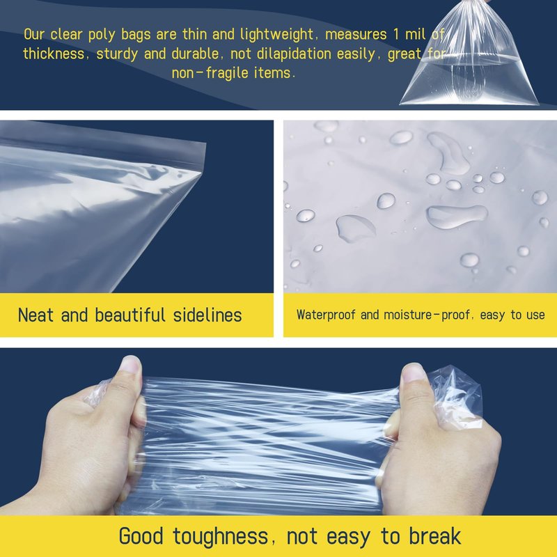 - Our clear poly bags are thin and lightweight, measures 1 mil of thickness, sturdy and durable, not dilapidation easily, great for non-fragile items.