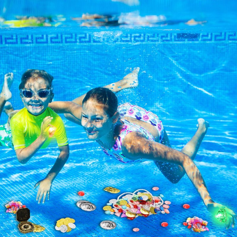 WGXX 85 Pieces Pirate Treasure Toys, Light-Up Diving Gem Colorful Pool Acrylic Diamonds Pirate Treasure Chest Gold Coins Pirate Map Compass for Children Pirates Themed Adventures Summer Pool