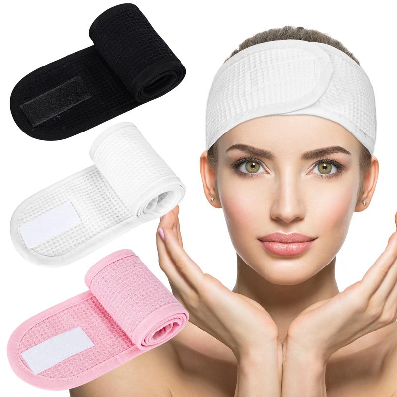 Whaline 3Pcs Spa Facial Headband White Black Pink Head Wrap Terry Cloth Waffle Adjustable Makeup Headband for Bath Sports Washing Face Shower