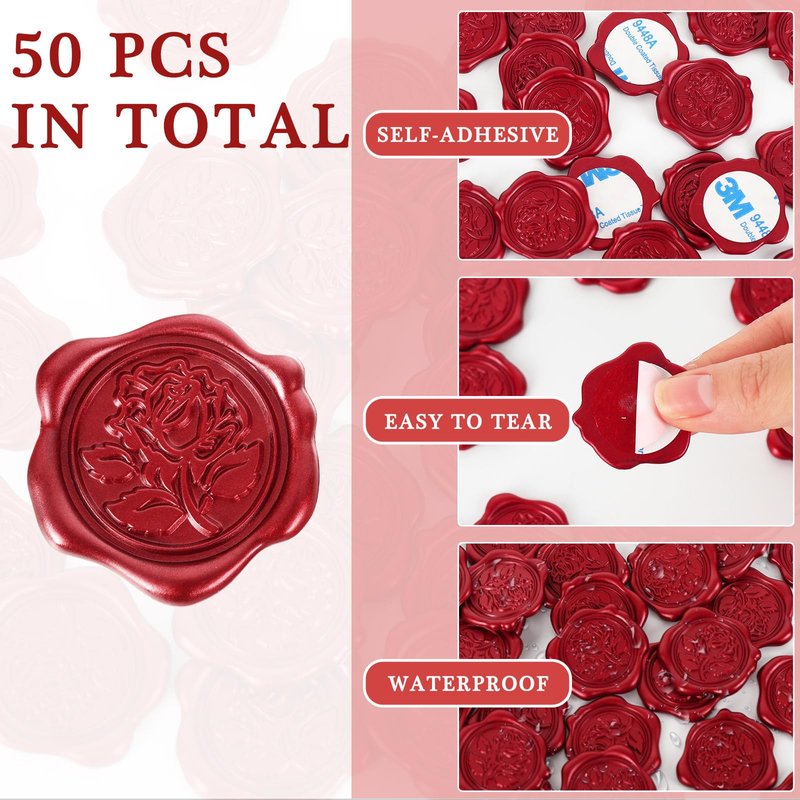 Whaline 50Pcs Wax Seal Stickers Red Rose Envelope Seal Stickers 3D Self-Adhesive Embossed Decals for Wedding Valentine Mother's Day DIY Greeting Invitation Cards Gift Decor