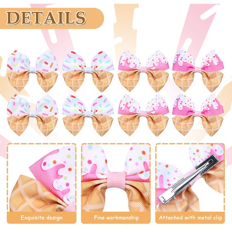 8pcs bow hair clips with assorted ice cream designs, cute and beautiful, suitable for many occasions.