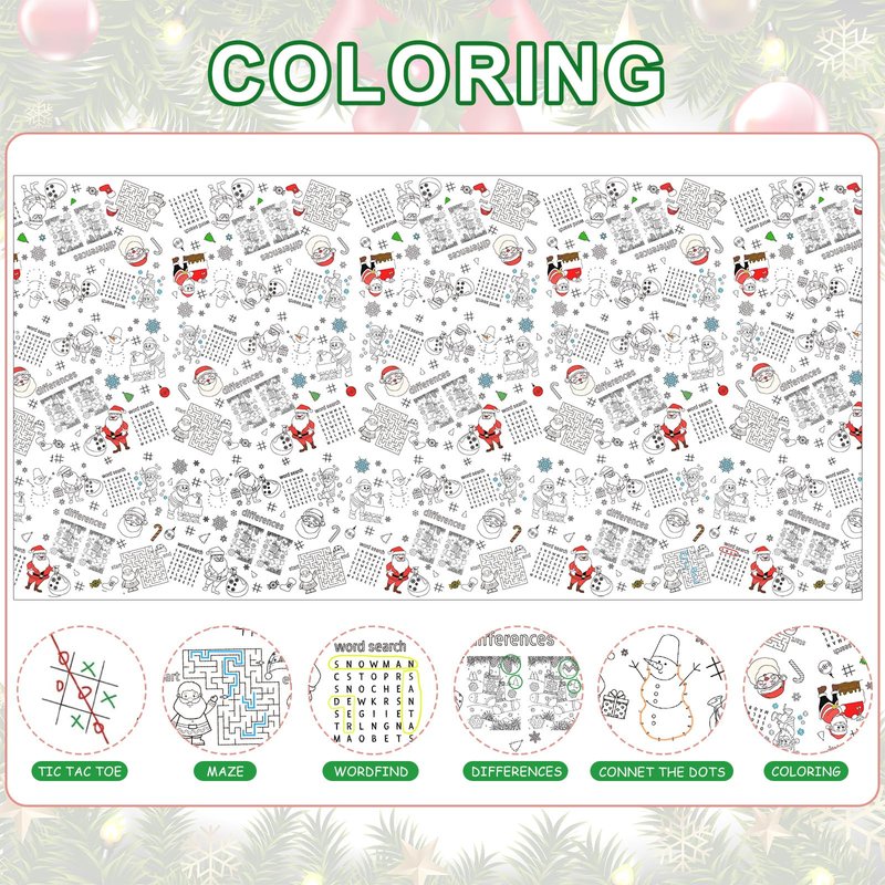 - Christmas Santa Design - Our painting tablecloth adopts classic Christmas motif, designed with Santa Claus, snowman, snowflake patterns and 6 different games, like word search, maze, differences, etc., make your Christmas party more interesting and meaningful!