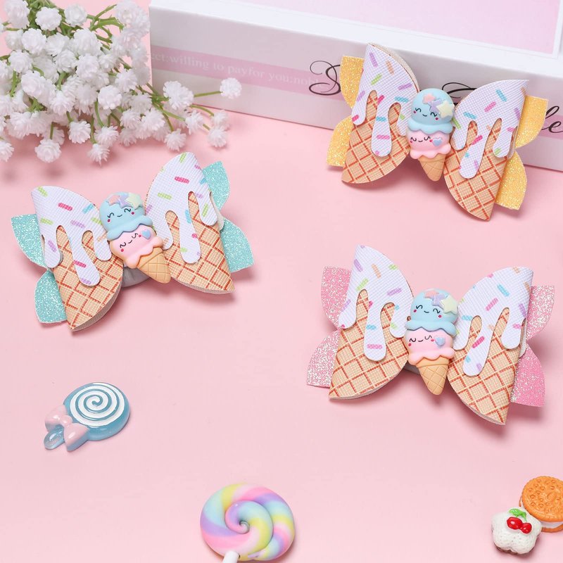 4pcs bow hair clips with assorted ice cream designs, colored in glitter yellow, green, pink and purple, cute and beautiful, suitable for many occasions.