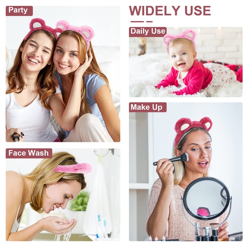 WHAVEL 2 Pcs Plush Animal Ears Headband, Cute Bear Costume Face Wash Hair Accessories for Adult Women Kids (Pink, Rose)