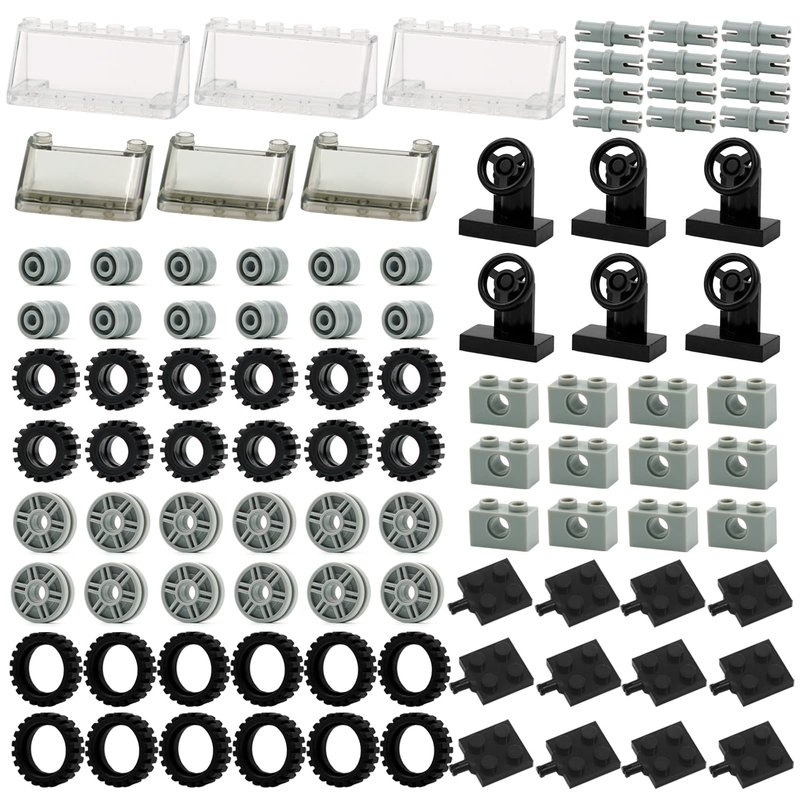 - 【102 PIECES】 Include Steering wheels, windshields, chassis, tires, wheels and axles pieces. Some parts require assembling.
