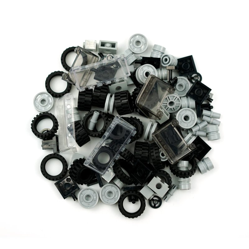Include Steering wheels, windshields, chassis, tires, wheels and axles pieces, totally 102pcs car parts and pieces.