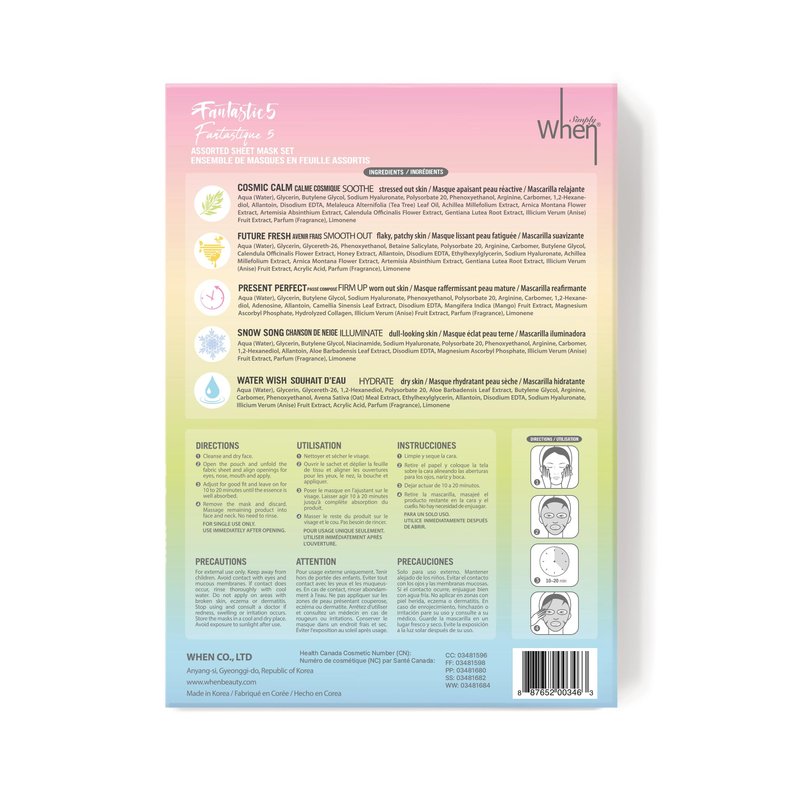 - 5 PACK Assortment of the Fantastic Five masks made with ultra-soft 100% cotton linter Bemliese sheet soaked in light, refreshing essence formulated with Sodium Hyaluronate and gentle high-quality plant extracts. Set contains Cosmic Calm, Future Fresh, Present Perfect, Snow Song, Water Wish.
