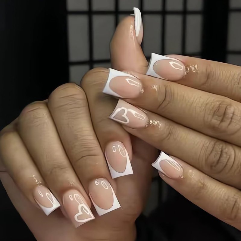 White French Tip Heart Press on Nails Medium Square Fake Nails Glossy Nude Acrylic False Nails Cute French Glue on Nails Reusable Stick on Nails for Women Valentine’s Day Nail Decorations, 24Pcs
