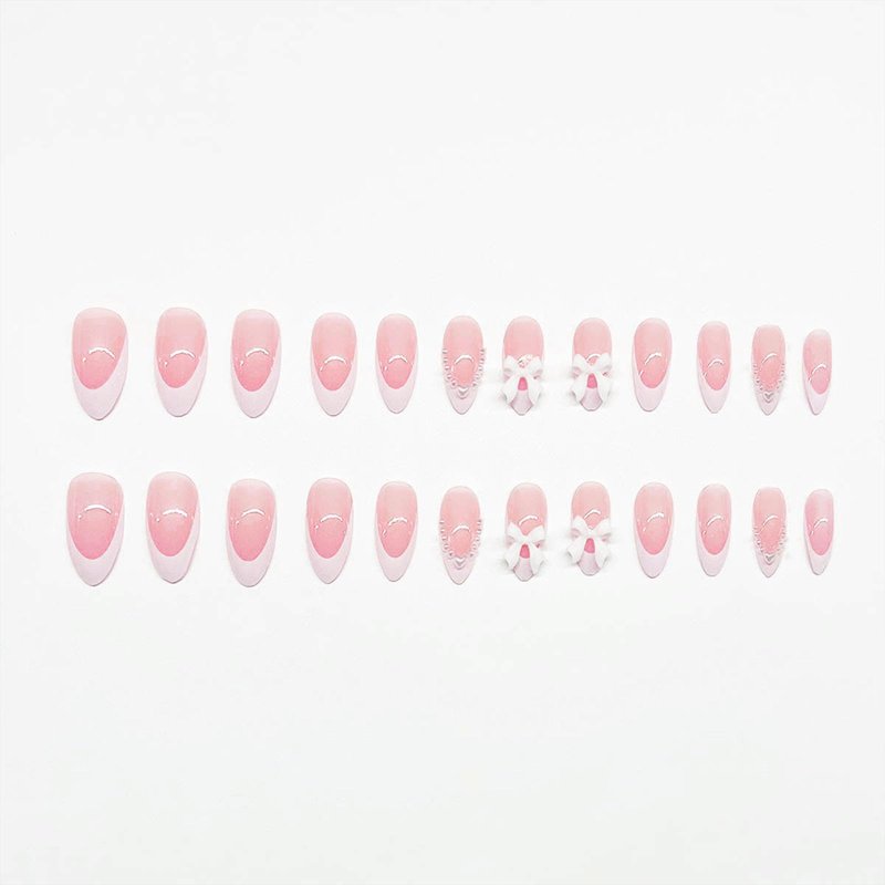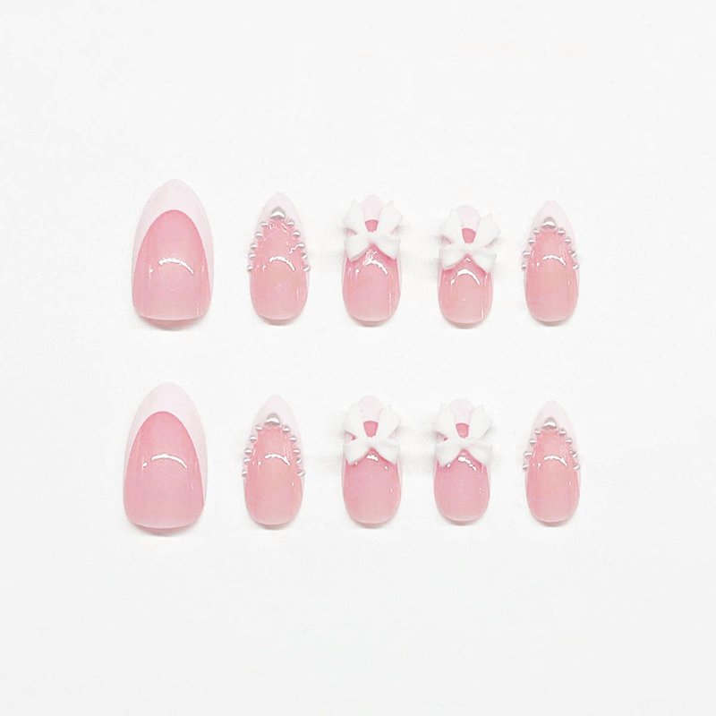 White French Tip Press on Nails Almond Medium Fake Nails with White Pearls Bow Designs Pink Full Cover Glue on Nails Press ons Acrylic False Nails Glossy Stick on Nails for Women Girls 24pcs
