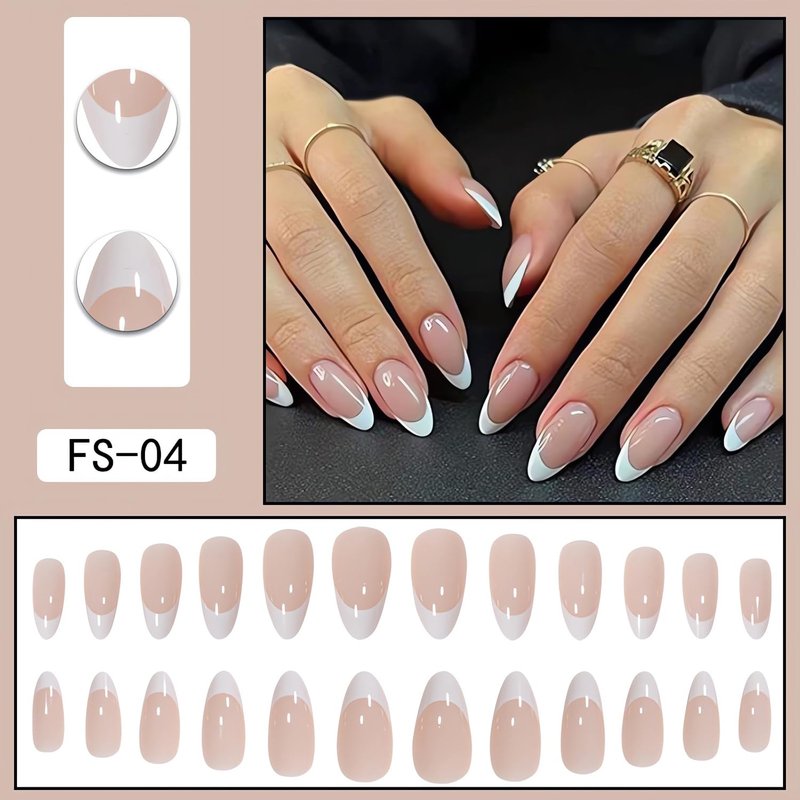 White French Tip Press on Nails Almond Shape Fake Nails Nude Medium False Nails Acrylic Artificial Nails Simple Glue on Nails Finger Decorations for Women 24Pcs
