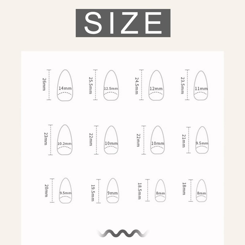- 【Package Contains】:You will get 24 piece almond press on nails, 1 nail file,1 wooden stick and 24 jelly glues, the fake nails are divided into 12 different sizes, it is convenient for you to choose the fake nails that suit your nail.No need to buy other things, you can get the nail salon-like effect.