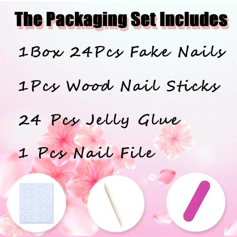 - Package Contents Kit- Our short press on nails is exquisite and cute. It contains 24 pcs glossy glue on nails and a set of DIY nail art tools. There are 12 different sizes of fake nails. You can choose the most suitable acrylic nails decor for yourself.