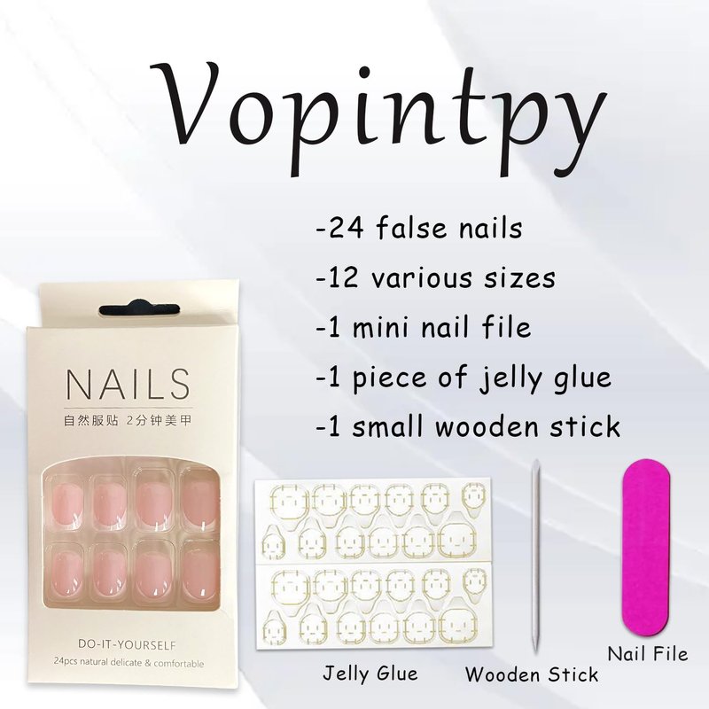 - 【Package & DIY Nails】You'll get 24 false nails in 12 sizes. 1 mini nail file, 1 small wooden stick, 1 piece of adhesive tab glue. You can safely choose a fake nail that fits your finger size and DIY your desired nail shape.