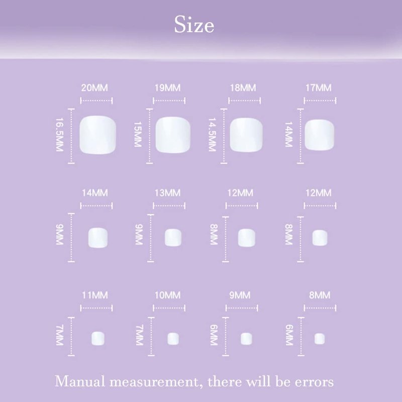 - Package Contains:24pcs French tip fake toenails, 24 pieces of jelly glue, 1 mini nail file, 1 wooden stick.(with 12 assorted sizes for easily matching each toe nail whatever your toenails size is)