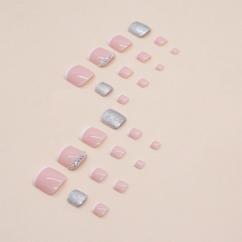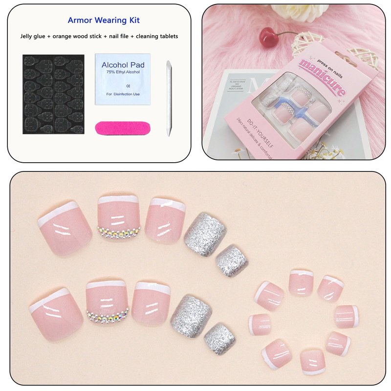 White French Tip Press on Toenails Square Fake Toenails Rhinestone Acrylic Toenails Pink Toe Nails Tips Glitter Powder Toe Nails Fake Nails Summer False Toe Glue on Toenails for Women