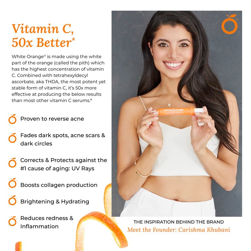 Product Benefits: Reverses fine lines & wrinkles Proven to REVERSE ACNE Brightens Hydrates Smoothens Boosts Collagen Fades Dark Circles, Dark Spots, Acne Scars Fades Hyperpigmentation Reduces Redness Evens Skin Tone Prevents Sagging - Firming Protects Against Sun Damage and Environmental Aggressors Helps wound healing, such as sunburn Brand: White Orange Skincare Scent: Natural hint of fresh orange Clean, Vegan, Cruelty-free, Paraben-free, Made in the USA Skin Type: Oily, Combination, Sensitive, Dry, Normal, Men and Women
