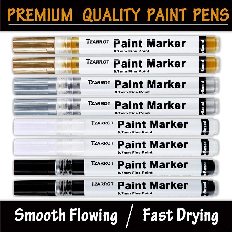 Details: ● Type of Ink: Water-Based Acrylic Ink. ● Feature: Extra fine tip, Waterproof pigment, Quickly drying, Non-toxic, No odor, No mess. ● Color: White & Black & Gold & Silver. ● Writing width: 0.7 mm. ● Package Included: 8 pack acrylic paint pens (2*White, 2*Black, 2*Gold, 2*Silver). ● Dimension of single pen: 5.24*0.43 Inches/133*11 mm. ● Dimension Package: 5.4*3.6*0.5 inches/92*12*137mm ● Gross weight/Package: 3.9 OZ Why Choose TZARROT Water-Based Paint Marker Pens?