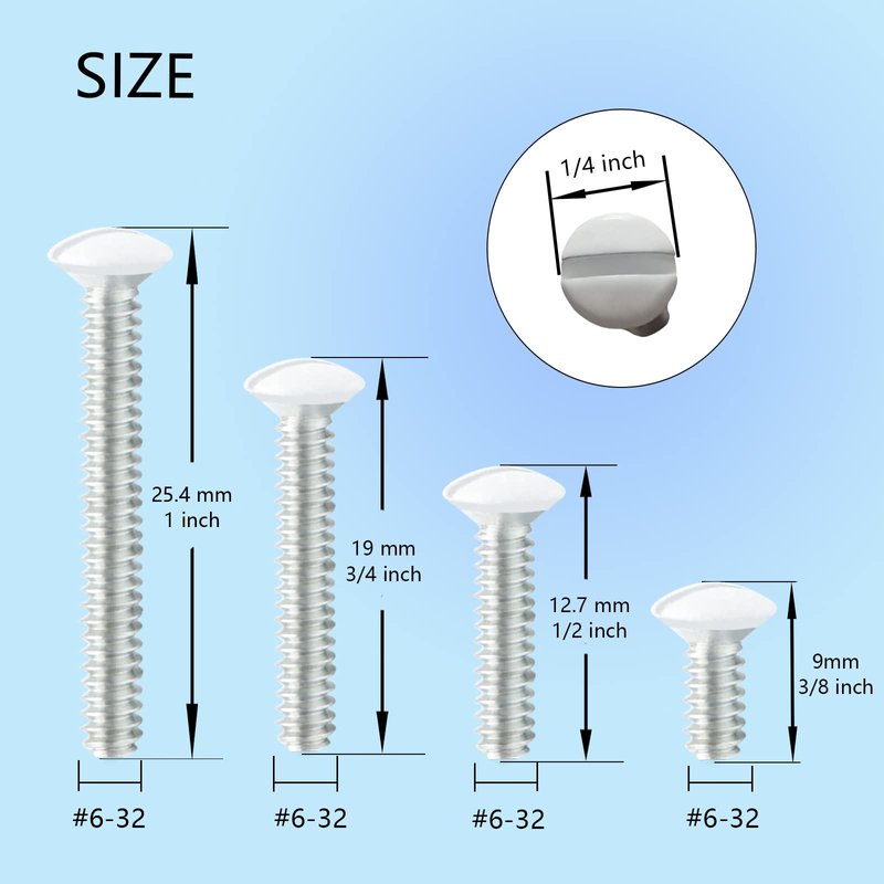 - 【Package Content】You will receive 100 pieces white wall outlet screws in 4 length sizes of 3/8'', 1/2'', 3/4''and 1'', 25 pieces for each size. Different sizes of screws make you get the job done fast to install your outlets or switch plate covers