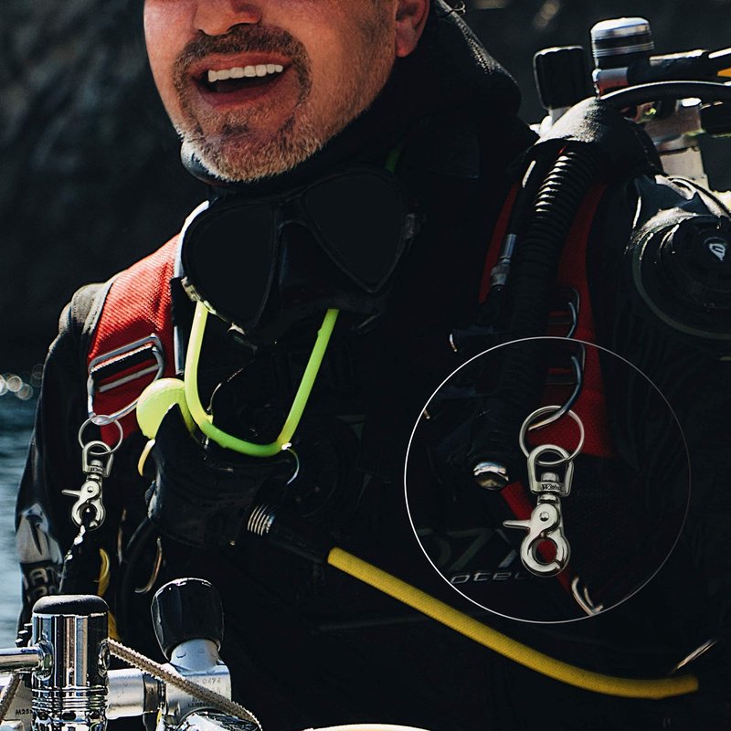 - ✅ 360 degree swivel, snaps easily on scuba BCD D rings with gloved fingers