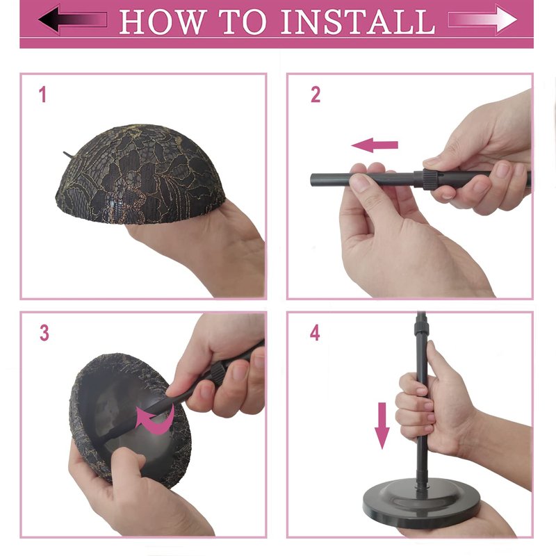 Package:Each wig stand display consists of a base, a textured dome and an adjustable rod, connect the thicker end of rod to the base and install the dome on the rod.