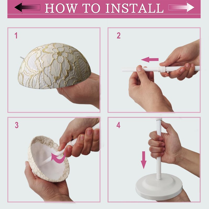 Package:Each wig stand display consists of a base, a textured dome and an adjustable rod, connect the thicker end of rod to the base and install the dome on the rod.