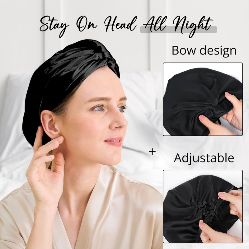 WIGI 100% Mulberry Silk Bonnet with Scrunchie Gift for Women, Silk Bonnet for Sleeping, Shower Cap Hair Bonnet, Silk Hair Wrap for Hair Care (100% Mulberry Silk (Bow design), Black)