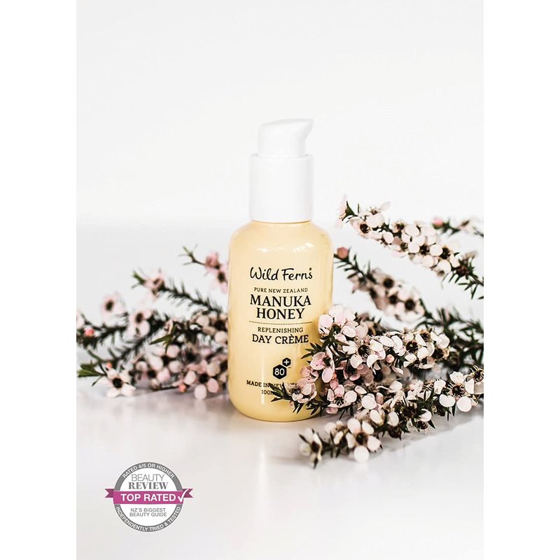 Manuka Honey Replenishing Day Creme 100 ml/3.38 oz. If you like a highly effective moisturizer without sunscreen and with a high natural content, this Wild Ferns product is for you. Premium Manuka Honey is blended with beauty oils rich in fatty acids and Chamomile Extract to soothe irritated skin.This Day Cream has 99% natural ingredients. Bee Pollen is one ingredient, so we recommend testing a small amount before applying.