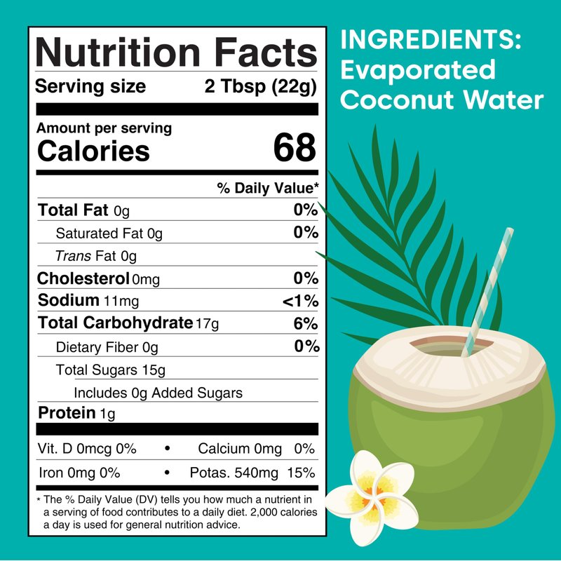 - Ingredients: Evaporated Coconut Water