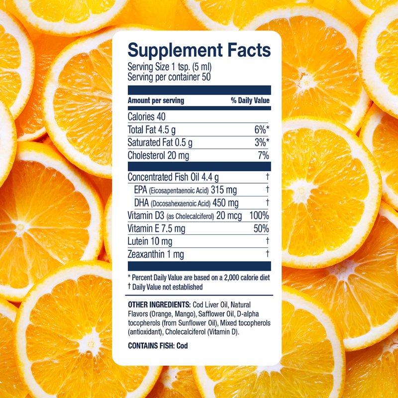 Support your overall health with Wiley’s Finest Cod Liver Oil. This natural cod oil supplement has a great-tasting orange flavor, making it a fish oil supplement you can look forward to taking. Cod liver oil supports brain health and your body’s ability to respond to stress. This liquid supplement provides 765mg of EPA and DHA omega-3s per teaspoon as well as 20mcg of vitamin D3, 7.5mg of vitamin E, and 10mg of FloraGLO Lutein. Each serving provides the vitamins and fatty acids needed to support your heart, skin, and brain health. This cod liver oil is made from wild Norwegian cod, sustainably sourced from the arctic waters of Norway. Adding omega-3s, vitamin D3, vitamin E, and lutein to your day is as simple as taking a teaspoon of Cod Liver Oil Plus.