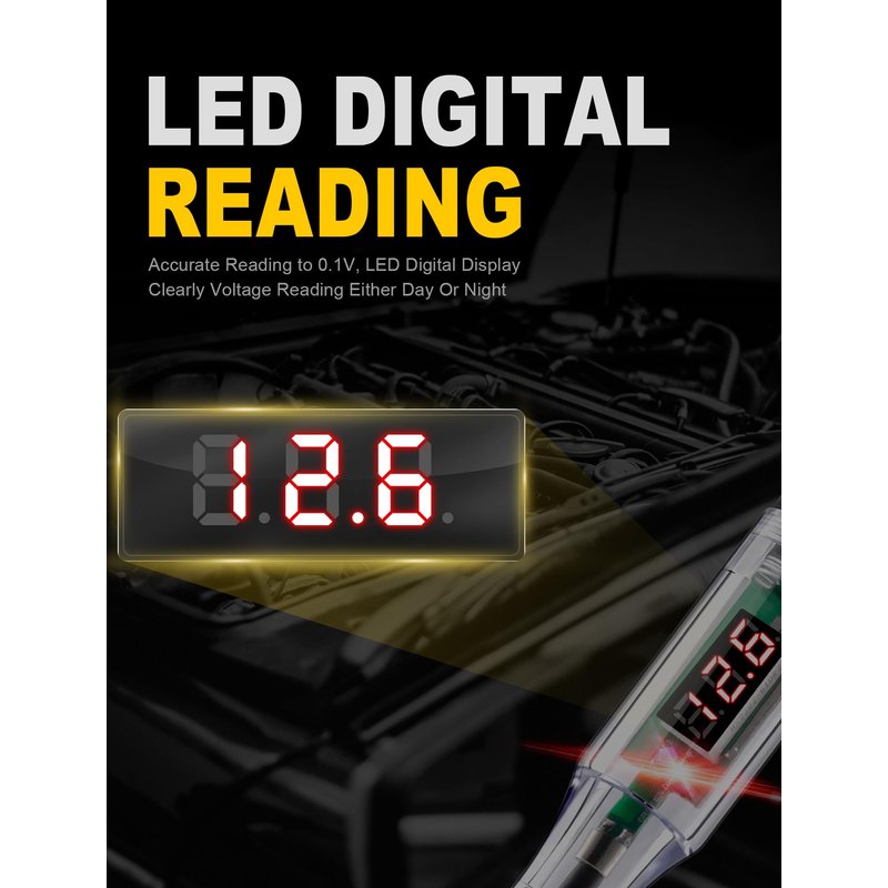 - 【Clear Digital Display & Readouts】: WINAMOO automotive circuit tester with a highly clear LED digital backlit display for voltage readings, 0.1V resolution with ±0.2V accuracy gives you clearly visible digital readouts. Compared with LCD lights, this light tester is not affected by the brightness of light, so that be clearly read in daytime or dark areas.